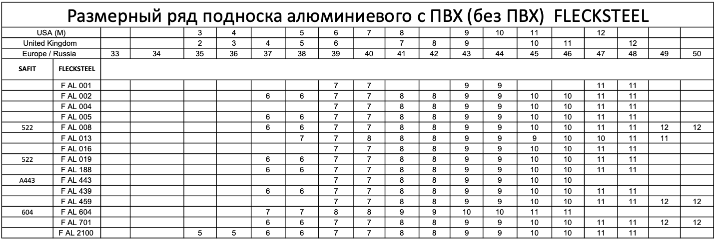 Подноски алюминиевые компании «Flecksteel» (Бразилия) изготавливаются из высокопрочного и качественного материала. Алюминиевый подносок значительно легче по весу стального, не подвержен коррозии и не намагничивается. Поставляется как с резинкой ПВХ так и без нее.